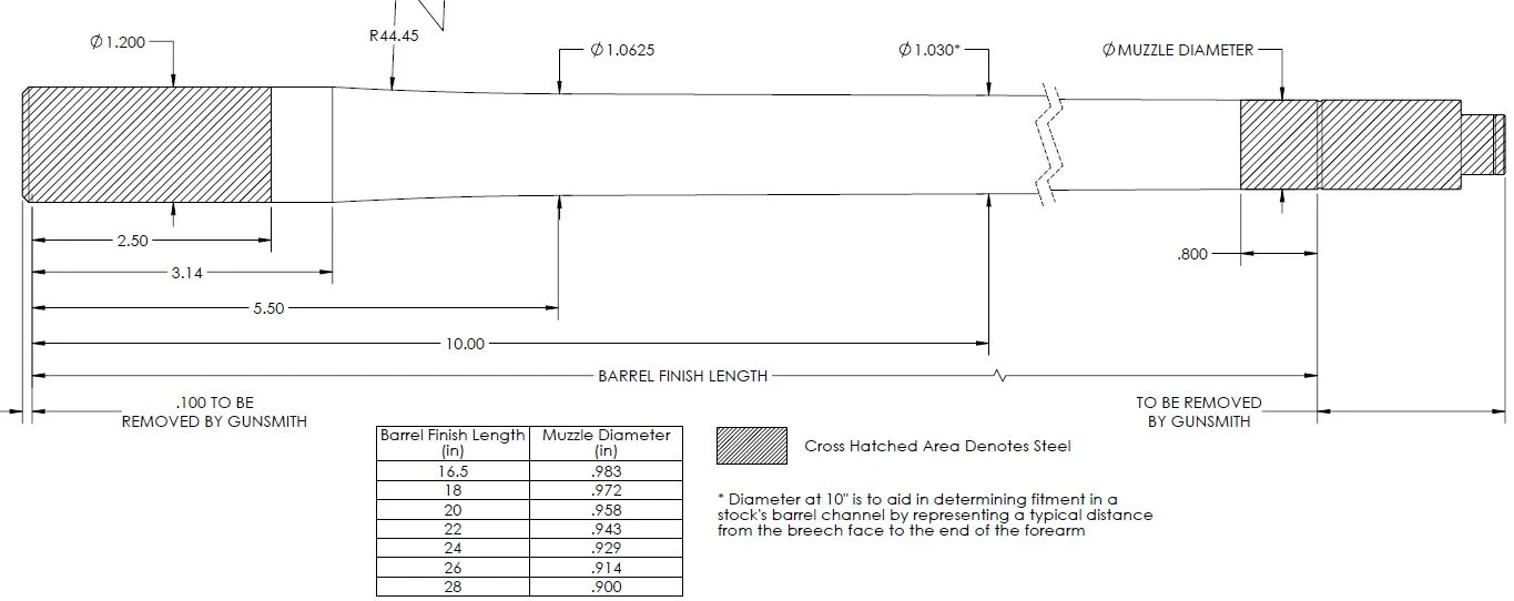 1,200" patruunapesän päästä, 2.5" mittainen pesänmitta ja piipunsuu 0.943".